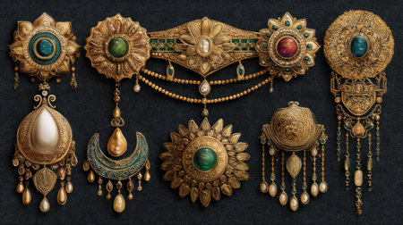 Detailed and elegant gold jewelry pieces with beads are featured in a closeup on a luxurious, dark, patterned fabric, exuding opulence and sophistication