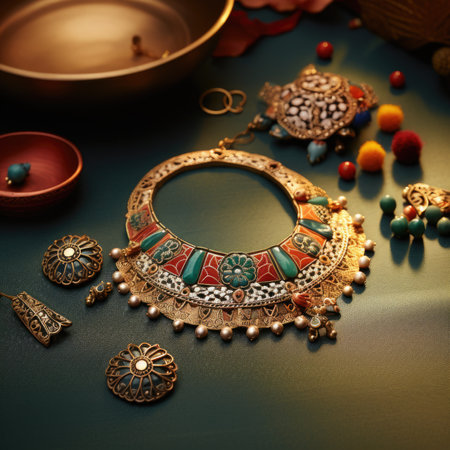 Colorful handmade jewelry and textiles showcase diverse cultural traditions and elegance generated by artificial intelligence