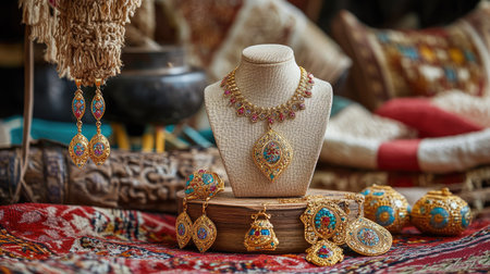 This stunning image showcases elegant gold jewelry adorned with colorful gemstones, set against a rich traditional fabric backdrop, capturing cultural craftsmanship and luxury.