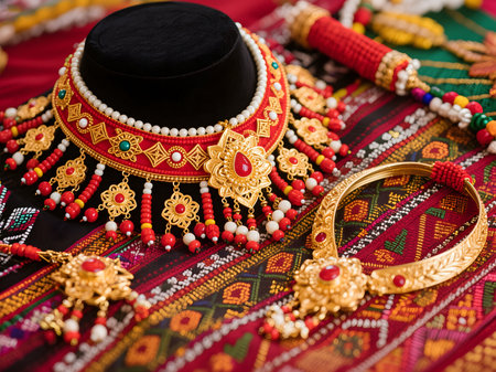 Discover the exquisite beauty of traditional jewelry and rich fabric featuring intricate gold embroidery, perfect for cultural celebrations or festive occasions.