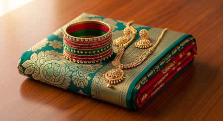Colorful Indian jewelry adorns wrists and necks in traditional celebration generated by artificial intelligence