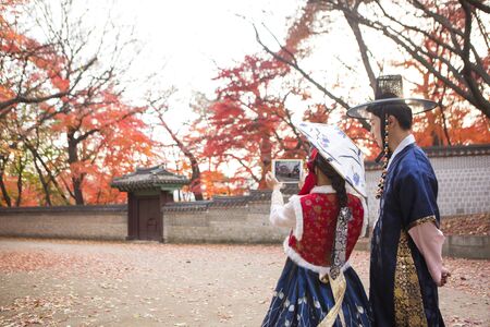 Young Asian newlywed couple in Hanbok, Korean traditional clothes walking around Hanok, Korean traditional house