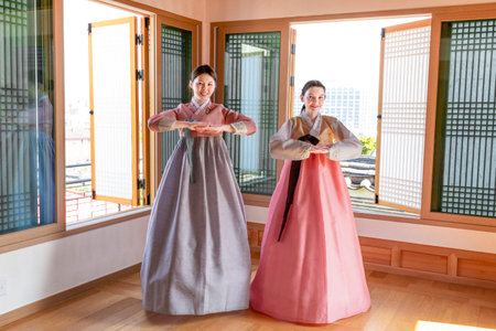 Experiencing Korean traditions in Hanok_Korean girl teaching Caucasian girl how to bow