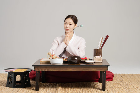 Beautiful young woman posing gracefully in traditional Korean hanbok decorated with delicate embroidery