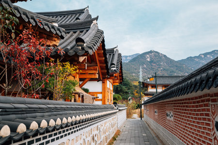 Eunpyeong Hanok Village with Bukhansan mountain at autumn in Seoul, Korea