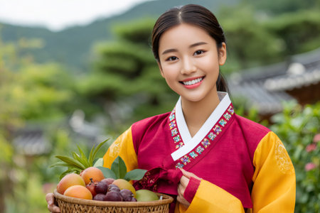 Young woman wearing colorful hanbok, holding wicker basket full of fresh fruit, smiling in traditional Korean garden