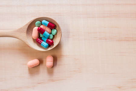 Close up pills in wood spoon on wooden table background.Top view with copy space for any design. Health and medical concept
