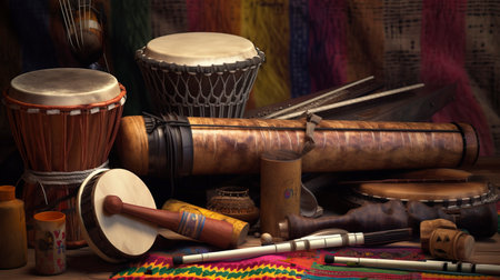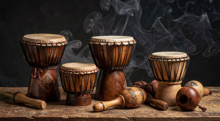 Collection of traditional African drums and percussion instruments on wooden surface. That the image is generated using AI.