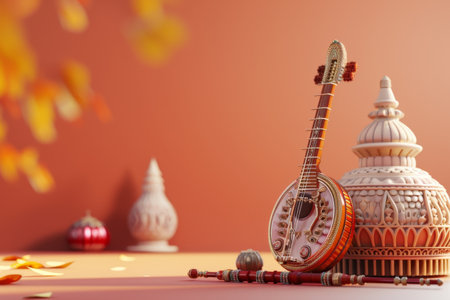 Traditional Hindu musical instruments with space for text on a plain background. Used in rituals.