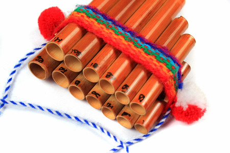 Close up view of Peruvian instruments on a grey sofa. Concept of traditional Andean music.