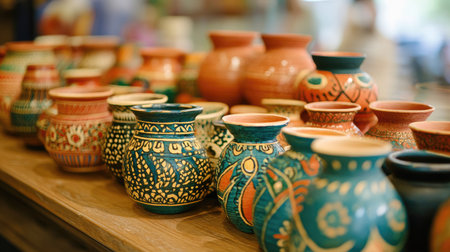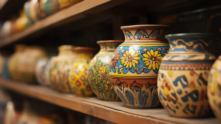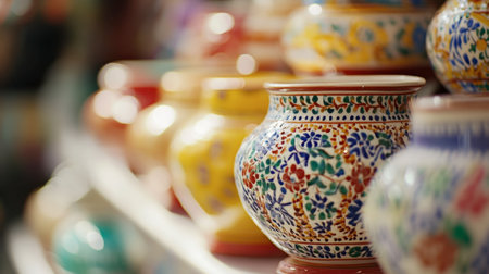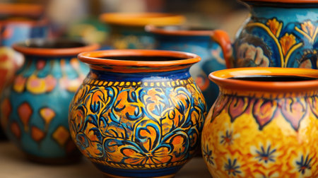 Vibrant collection of hand-painted ceramic pots with intricate patterns. That the image is generated using AI.