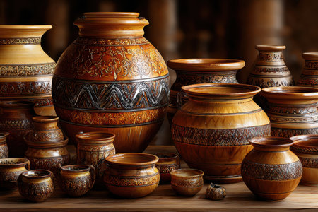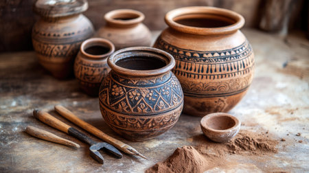 Explore the beauty of traditional pottery with handcrafted jars and tools arranged on a rustic wooden surface, showcasing earthy textures and intricate patterns in a serene setting.