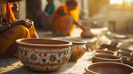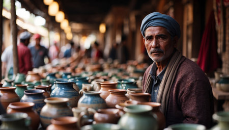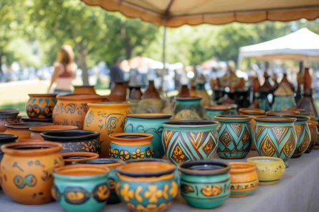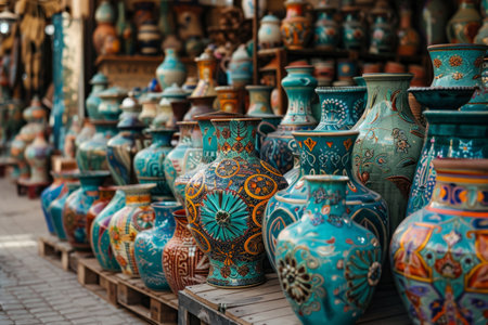 AI Generated. a traditional pottery market with colorful ceramics and artisans