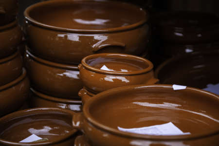 Many handmade brown clay pots, bowls, mugs. Ceramic clay, different kitchen utensils at shelf of street market