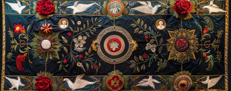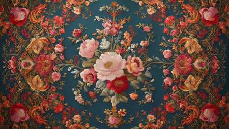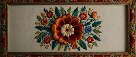 Detailed floral embroidery with rich colors and textures, highlighting craftsmanship and artistic design, ideal for textile enthusiasts and creative projects, AI generated
