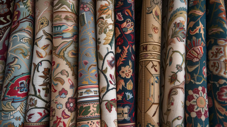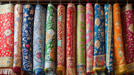 A variety of decorative rugs featuring intricate patterns and vibrant colors neatly rolled up and displayed side by side.