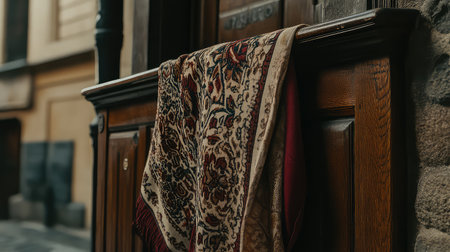 A beautifully crafted traditional fabric is elegantly draped over a wooden surface, set against a charming historic street, showcasing artistry and culture.