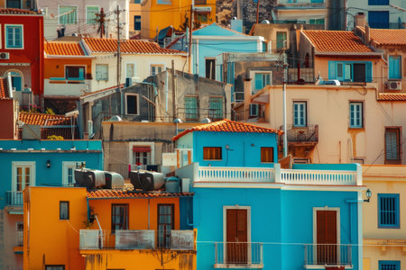 Colorful Houses on a Hillside in Crete, Explore the juxtaposition of old and new by blending traditional Greek architectural elements with a modern cityscape