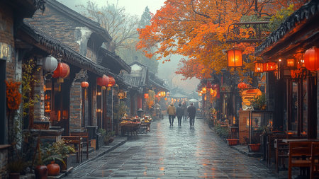 Cozy Small Town Street in Autumn with People Walking on a Sunny Morning