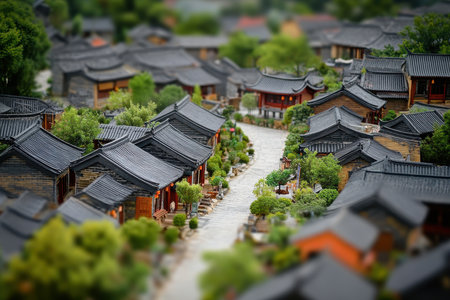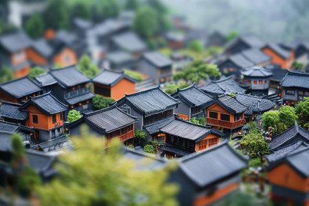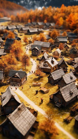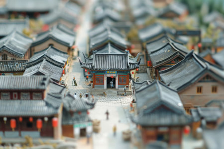 The vibrant rooftops of a traditional village are captured in a miniature perspective, with individuals strolling through streets, surrounded by historic architecture under clear skies.