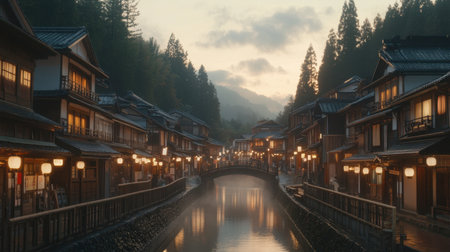 Experience the tranquility of a historic Japanese town at twilight, featuring traditional architecture along the river, surrounded by mountains and illuminated by warm lantern lights.