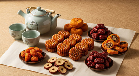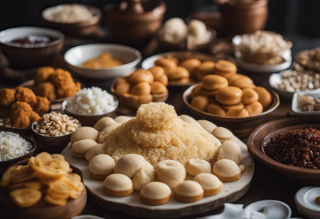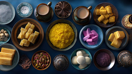 A colorful assortment of regional sweetmeats, each representing a different culture and tradition, displayed on a decorative table.