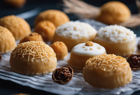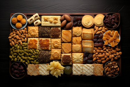 a close-up of a beautifully arranged tray of pastries and confectionaries, created with generative ai