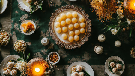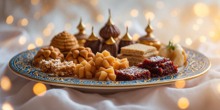 Delicious assortment of traditional sweets arranged beautifully on a decorative plate with warm bokeh in the background