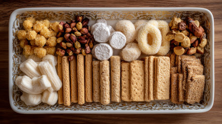 Korean sweets, flat lay, top view assorted cookies and traditional desserts, AI generative overhead view of knolling arrangement