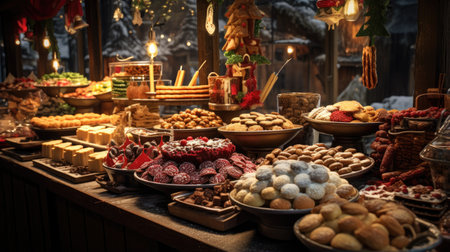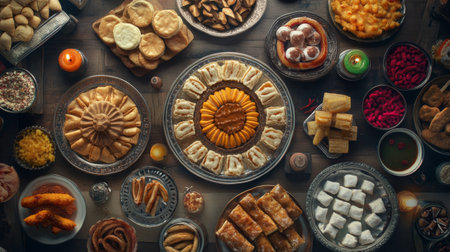 A vibrant display of an array of delectable sweets and pastries set on a table, ideal for festive gatherings and celebrations. This enticing arrangement tempts the palate with its colorful variety and rich textures.