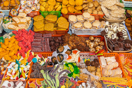 A vibrant display of assorted sweets featuring golden yellow and rich chocolate treats, showcasing the diversity of flavors found at a bustling market stall.