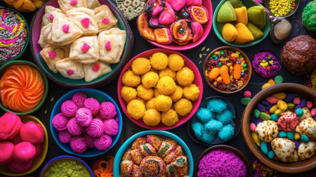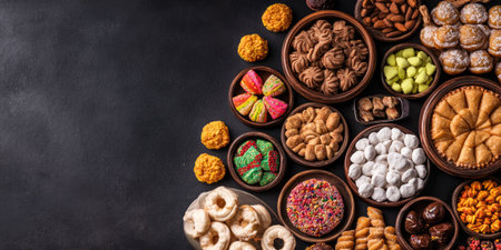 Top view of colorful mithai assortment with space for festival greetings or product branding.