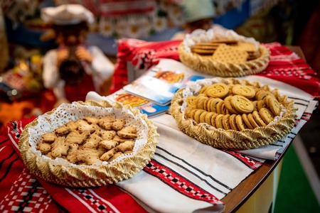A colorful display of Northern foods at a local fair, featuring sweet and savory treats made from traditional recipes.
