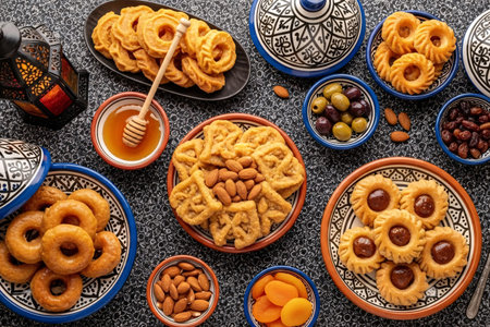 Vibrant assortment of traditional Moroccan sweets is presented on plates and in bowls, showcasing the rich culinary heritage of Morocco
