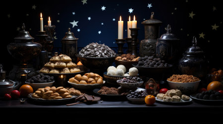 A beautiful arrangement of assorted Middle Eastern desserts displayed on an ornate golden plate. Delicate sweets, illuminated by flickering candles, create a warm, inviting ambiance perfect for celebrations.