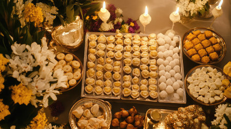 Diwali festive season celebration with a silver tray full of assorted indian sweets and snacks, surrounded by flowers and tea lights