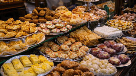 A vibrant display of assorted pastries and sweets showcases a variety of tempting baked goods. The colorful arrangement invites indulgence and celebration.