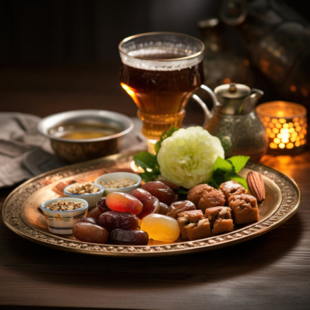 traditional Ramadan sweets and tea on a wooden table, representing the joy of breaking the fast during Ramadan.