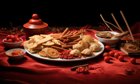 Chinese festive table asian food flat lay view. Lunar new years. Chinese New Year. Asian festive food
