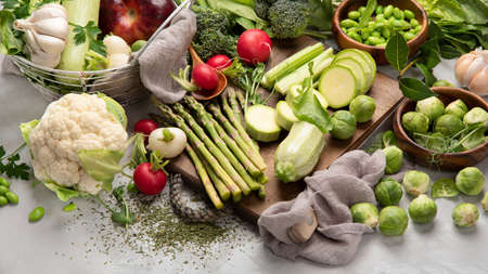 Raw and fresh spring vegetables on light background. Healthy food concept.