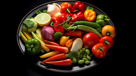 A vibrant assortment of fresh organic vegetables and fruits displayed artfully on a dark background, perfect for any culinary or nutrition-focused project.