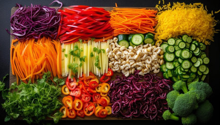colorful sliced vegetables arranged in a bowl, created with generative ai