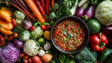 A vibrant spread of various fresh vegetables arranged beautifully alongside a bowl of spicy chili dip, showcasing the colorful ingredients of Thai cuisine.