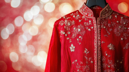 This stunning red ethnic garment features intricate embroidery and a vibrant design, perfect for celebrations. The blurred shimmering background enhances its elegance.