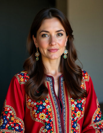 This captivating portrait features a woman adorned in a vibrant traditional Chechen outfit, showcasing intricate embroidery. Her confident gaze reflects the rich culture of Chechnya.