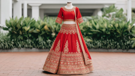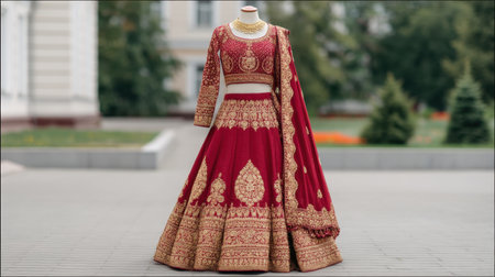 A stunning traditional dress with intricate gold embroidery set against a rich red background, perfect for weddings and cultural celebrations, exuding elegance and beauty.