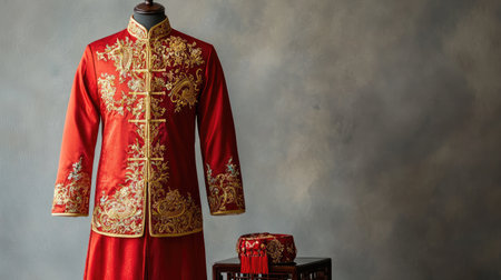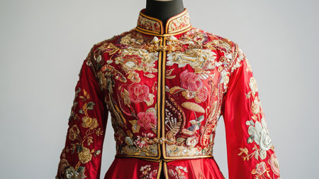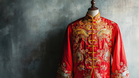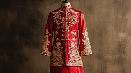A stunning display of a traditional red Chinese garment adorned with intricate gold embroidery, set against a textured backdrop, showcasing cultural elegance and artistry.