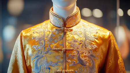 Stunning display of a golden mandarin jacket featuring detailed embroidery, perfect for showcasing cultural heritage and traditional fashion aesthetics in a boutique setting.