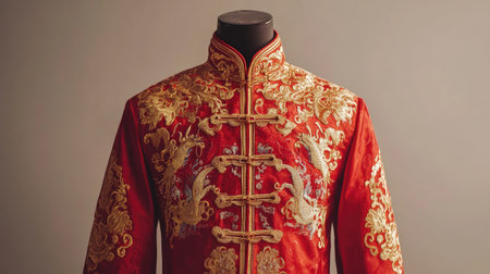 This captivating image features a vibrant red traditional jacket, richly embroidered with dragons, showcased on a mannequin, embodying cultural elegance and fine craftsmanship.