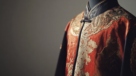 This striking red traditional Chinese garment features exquisite gold embroidery, celebrating rich cultural heritage. Perfect for showcasing unique fashion aesthetics and artistry.